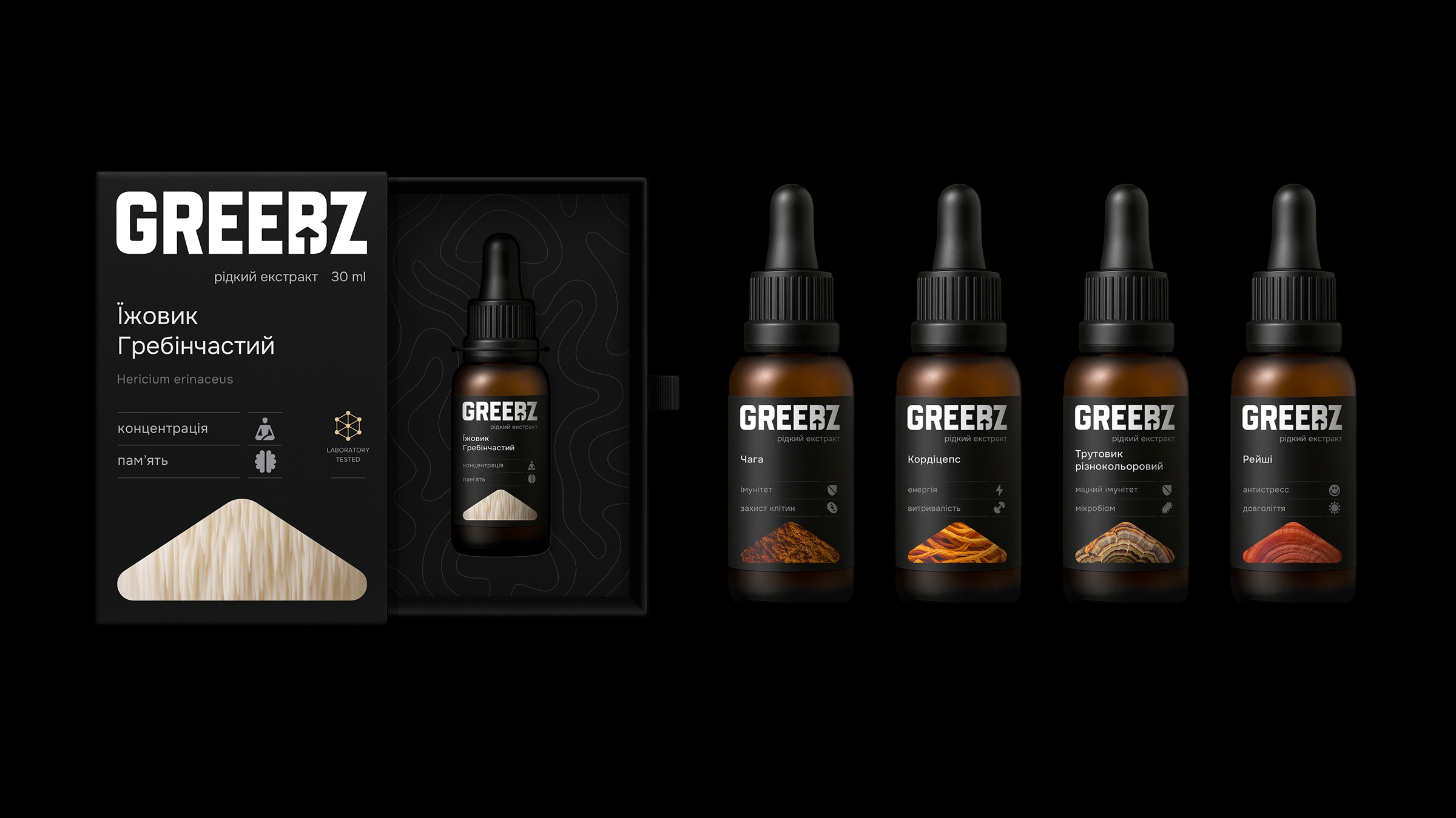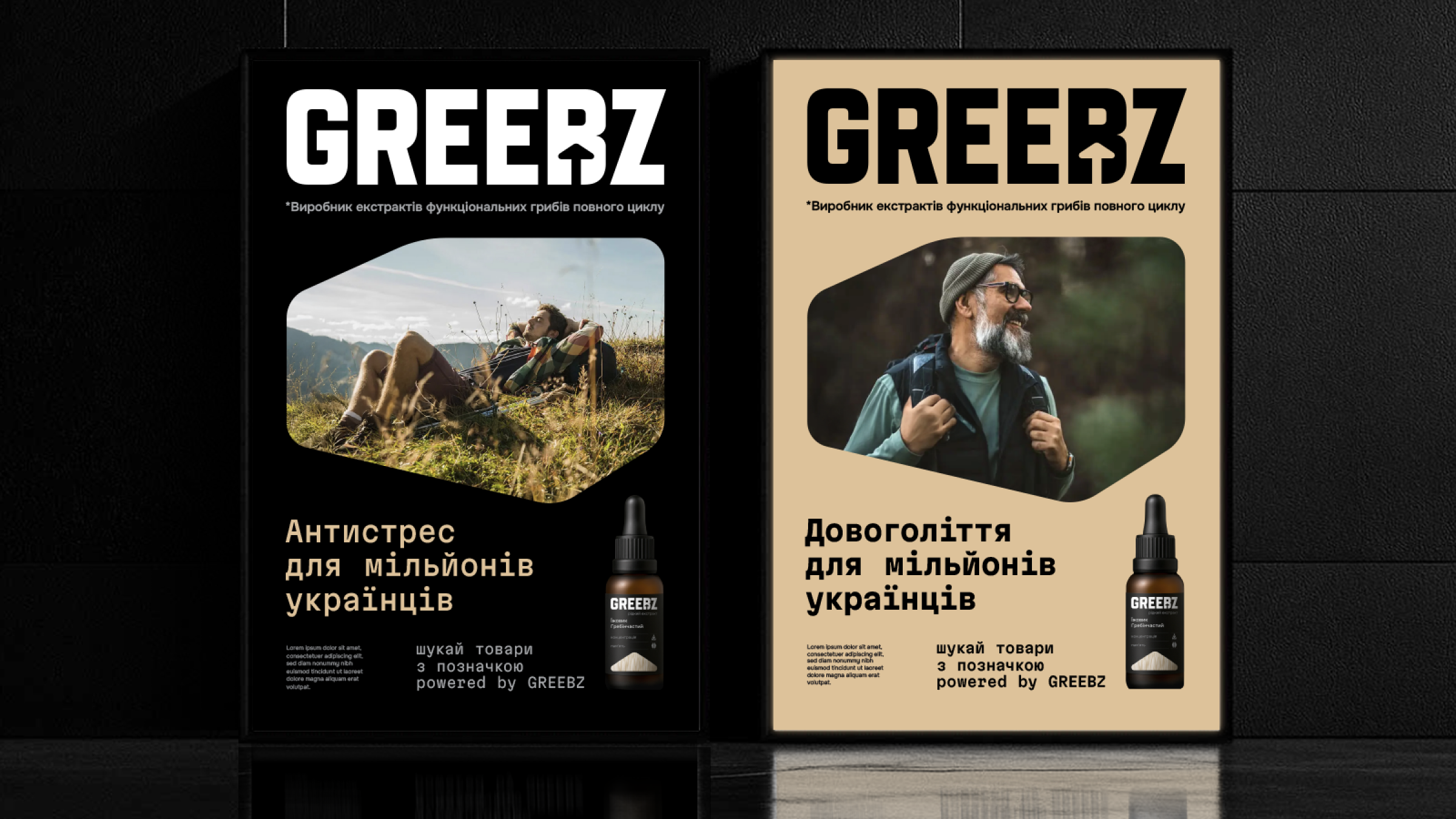 - Бренд стратегія: від назви, що несе характер і тон бренду, до цінностей, позиціювання, візії, місії та стратегічної задачі. Позиціювання GREEBZ – ми більше ніж виробник грибів, ми створюємо здорові продукти нового покоління. Місія бренду – відкрити силу грибів для мільйонів українців. Візія бренду – побудувати мільярдний ринок функціональних грибів і стати ключовим драйвером його розвитку. Key message box: здоровий сон; антистрес; пам’ять; енергія; спокій; фокус – для мільйонів українців.